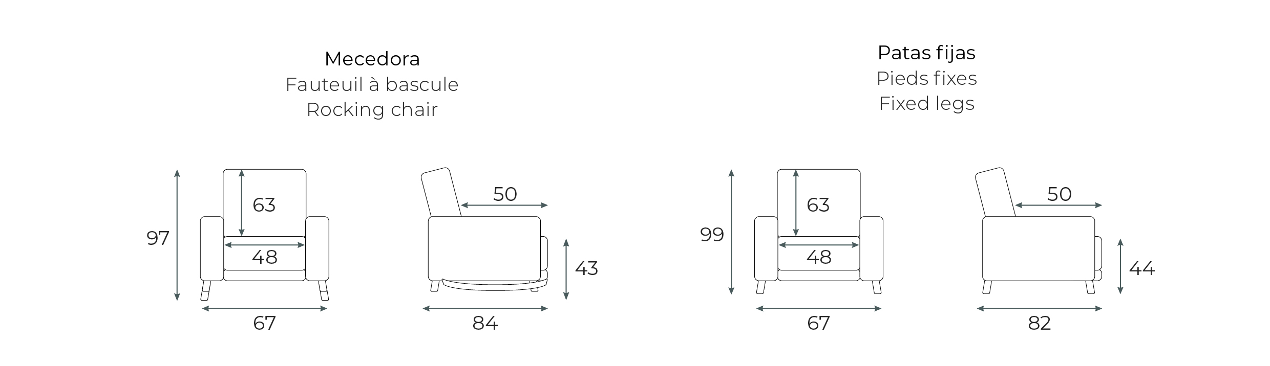 Su versión con patas fijas garantiza estabilidad, haciéndola ideal para momentos de lectura. En su versión mecedora, proporciona una experiencia de relajación inigualable, con un diseño ergonómico que asegura una postura correcta, manteniendo la espalda recta y los brazos bien apoyados.