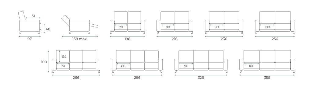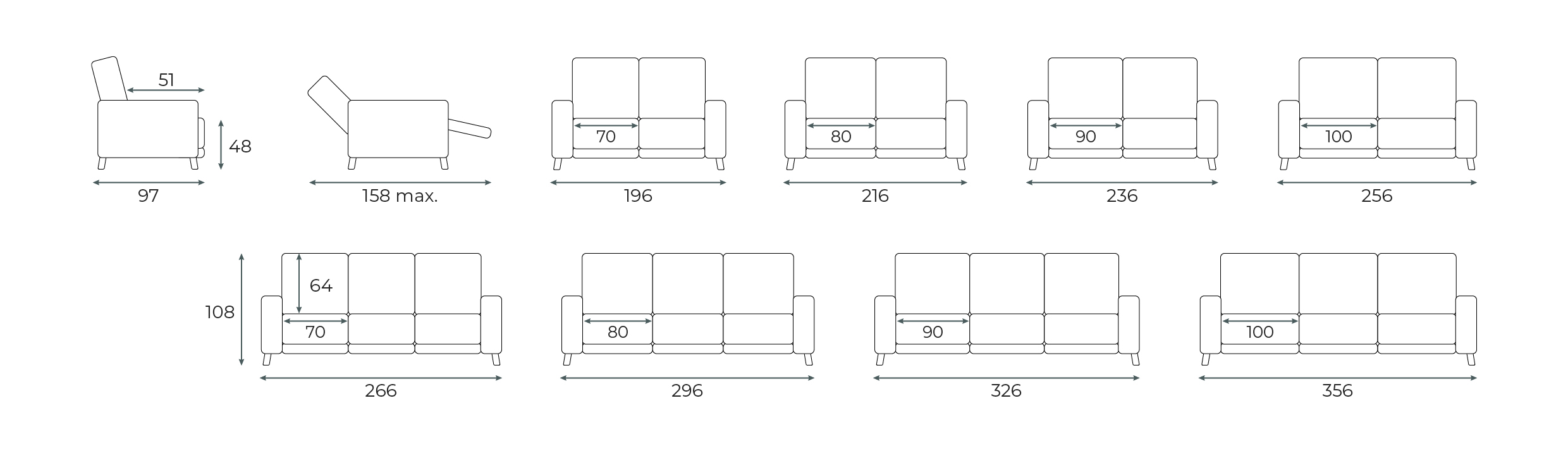 • Ancho de asiento 70, 80, 90 o 100 cm.